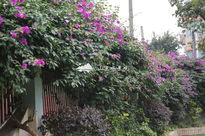建设思路:赵镇第二幼儿园围墙原来无绿化,采用建设花台栽植多年生木本的三角梅花卉植物进行美化,在幼儿园内外形成一道美丽风景。