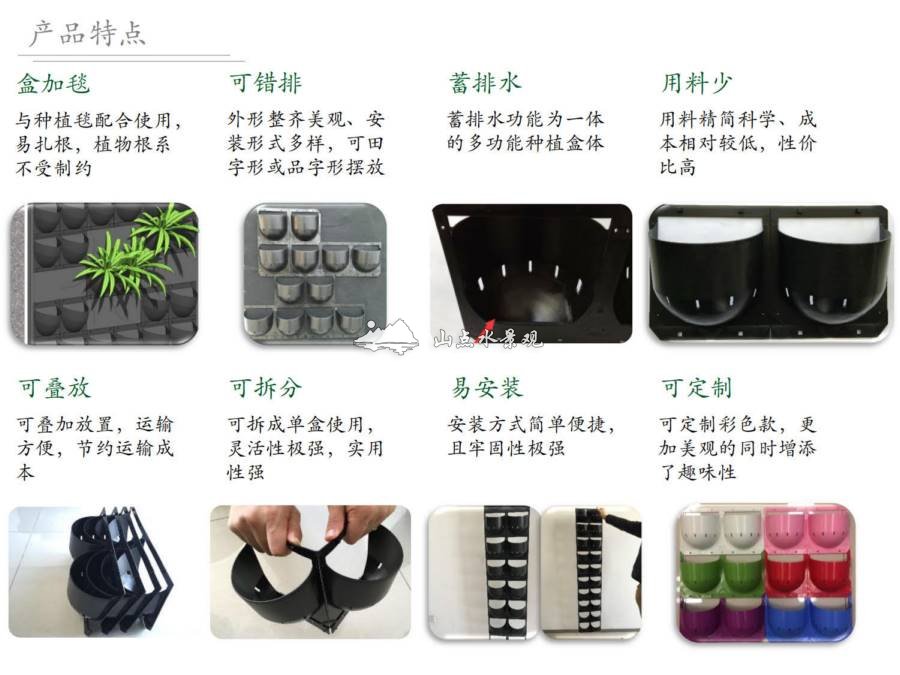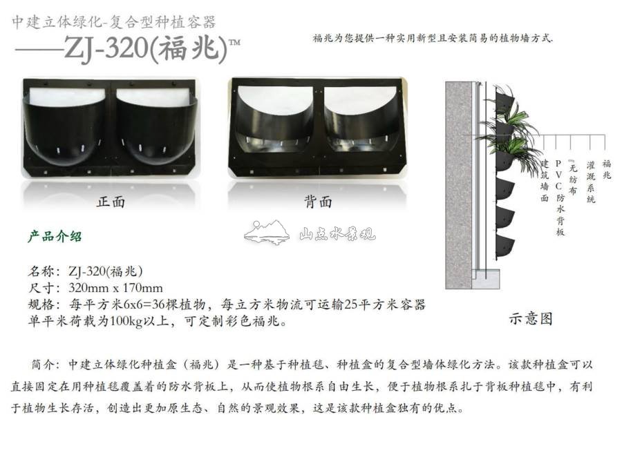产品优势:中建立体绿化种植盒(福兆)是一种基于种植毯、种植盒的复合型墙体绿化方法。该款种植盒可以直接固定在用种植毯覆盖着的防水背板上,从而使植物根系自由生长,便于植物根系扎于背板种植毯中,有利于植物生长存活,创造出更加原生态、自然的景观效果,这是该款种植盒独有的优点。